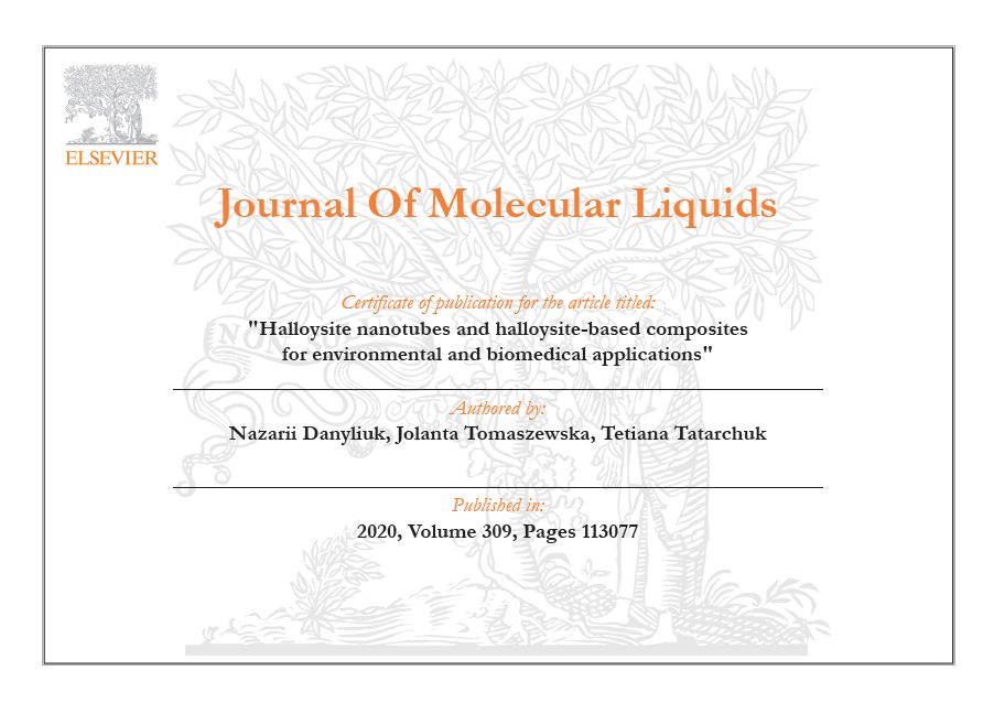 Кафедра хімії пишається тим, що наукове дослідження магістранта-хіміка першого року навчання Назарія Данилюка опублікували у високорейтинговому міжнародному журналі. Йдеться про «Journal of Molecular Liquids» (SCOPUS, Impact Factor = 4.561, https://doi.org/10.1016/j.molliq.2020.113077). Саме у цьому престижному науковому виданні опубліковано оглядову статтю «Halloysite nanotubes Читати далі